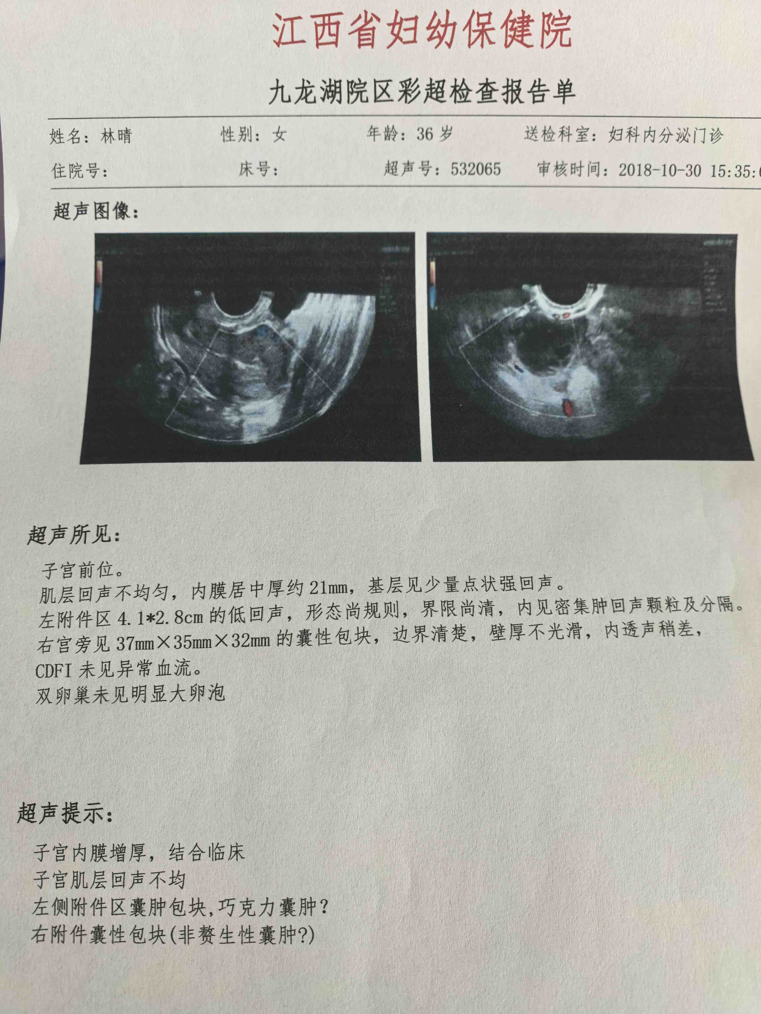 我叫林晴,是一名杂志编辑,今年38岁,江苏人,自从毕业步入这个行业之后,经常接到全国各地的来报,出差自然是家常便饭,这些年也由于我比较勤奋,业务能力也越来越精进,工作能力越来越突出。但是人生不可能两全其美,繁忙的工作压力不知不觉中,我竟然患上了卵巢囊肿,经常感觉到下腹不适,小肚子坠胀,腰酸腿疼,痛经,尿频,以为是上班压力大累的,偶尔月经不调也是正常的事。可是这种症状一直持续,并没有随着时间逐渐减轻,一次去厕所发现腰围增粗了,用手摸到右下腹有个包块疙瘩,我觉的不对劲,去省立医院做了B超检查,报告单出来,果然是出了事,发现右侧腹部有一个 3.8公分的卵巢囊肿,让我不知所措。